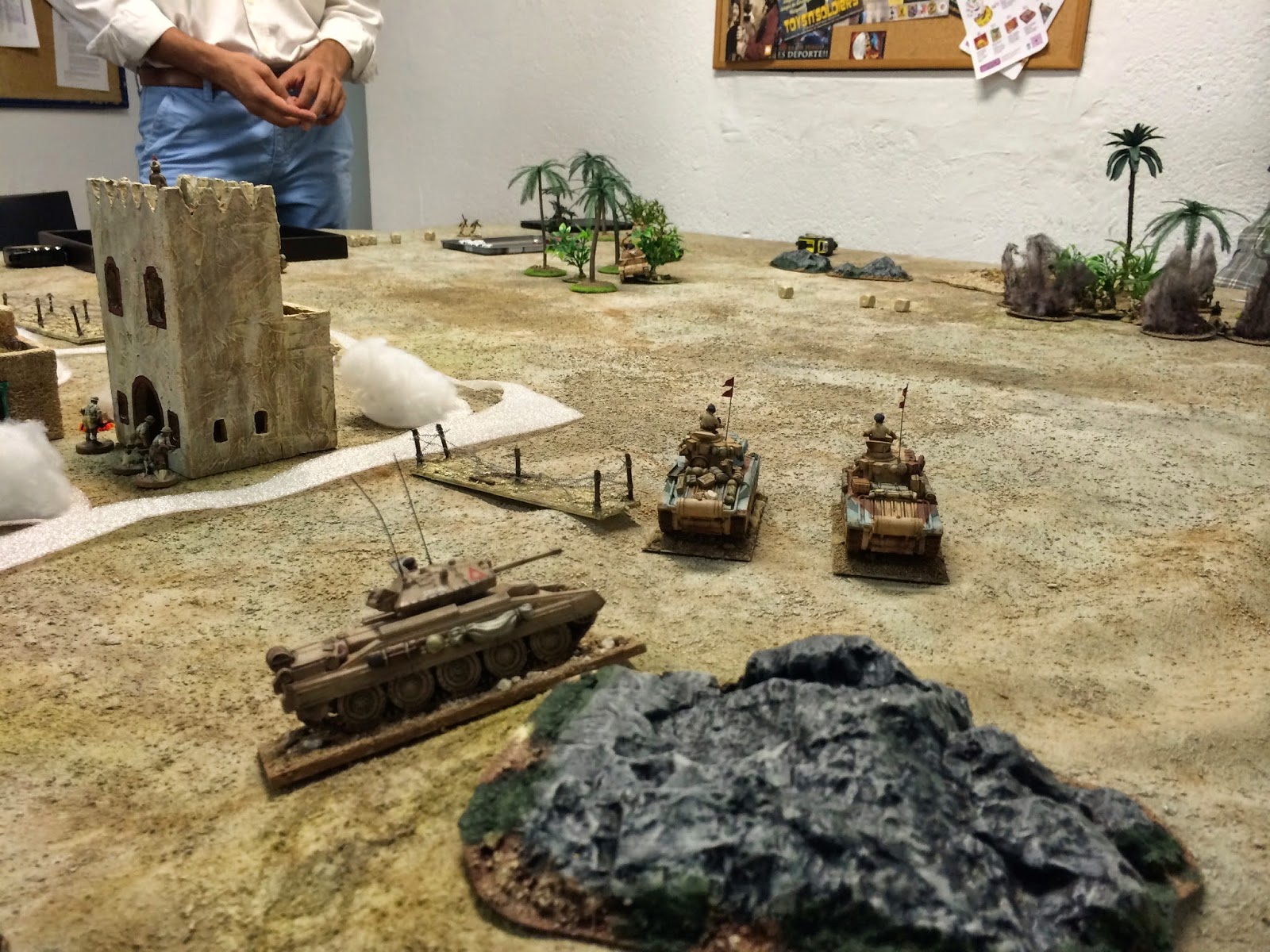 As the Axis forces had been playing most of the campaign with the German assets, these arrived to this last battle in brittle condition, and for this reason we decided to deployed our fresh (and relatively untested) Italian platoon, reinforced with a tank troop (3 x M13s) and the remnants of a panzergrenadier platoon. On the British side, two understrength Empire infantry platoons (one Indian and one Australian) manning the defences supported by the remaining surviving tanks (2 Cruiser and 2 Matildas).