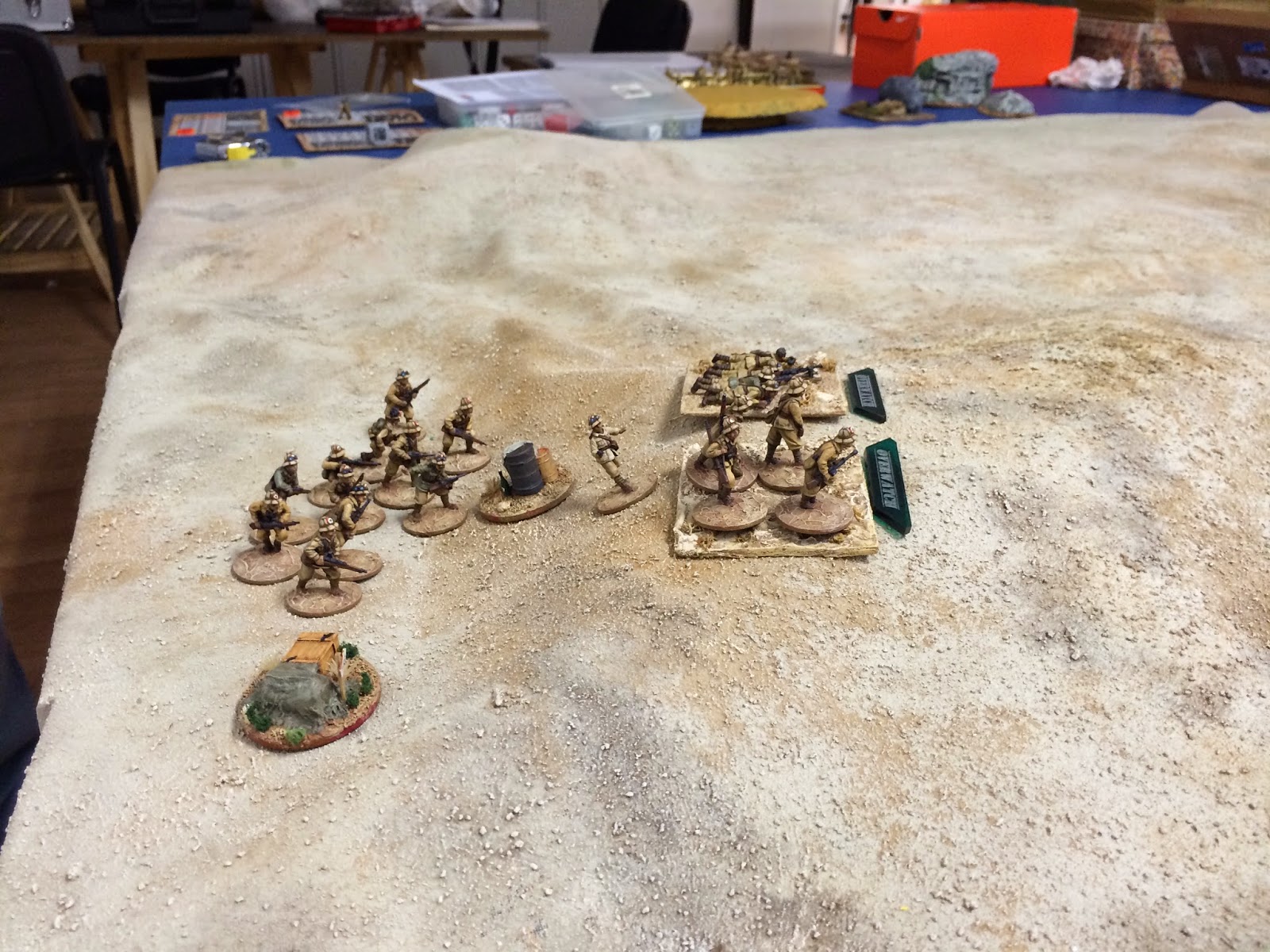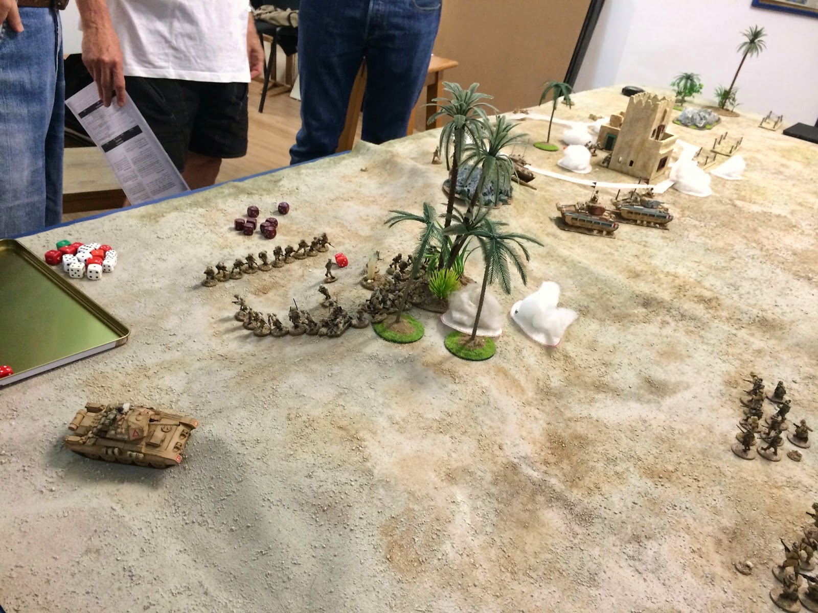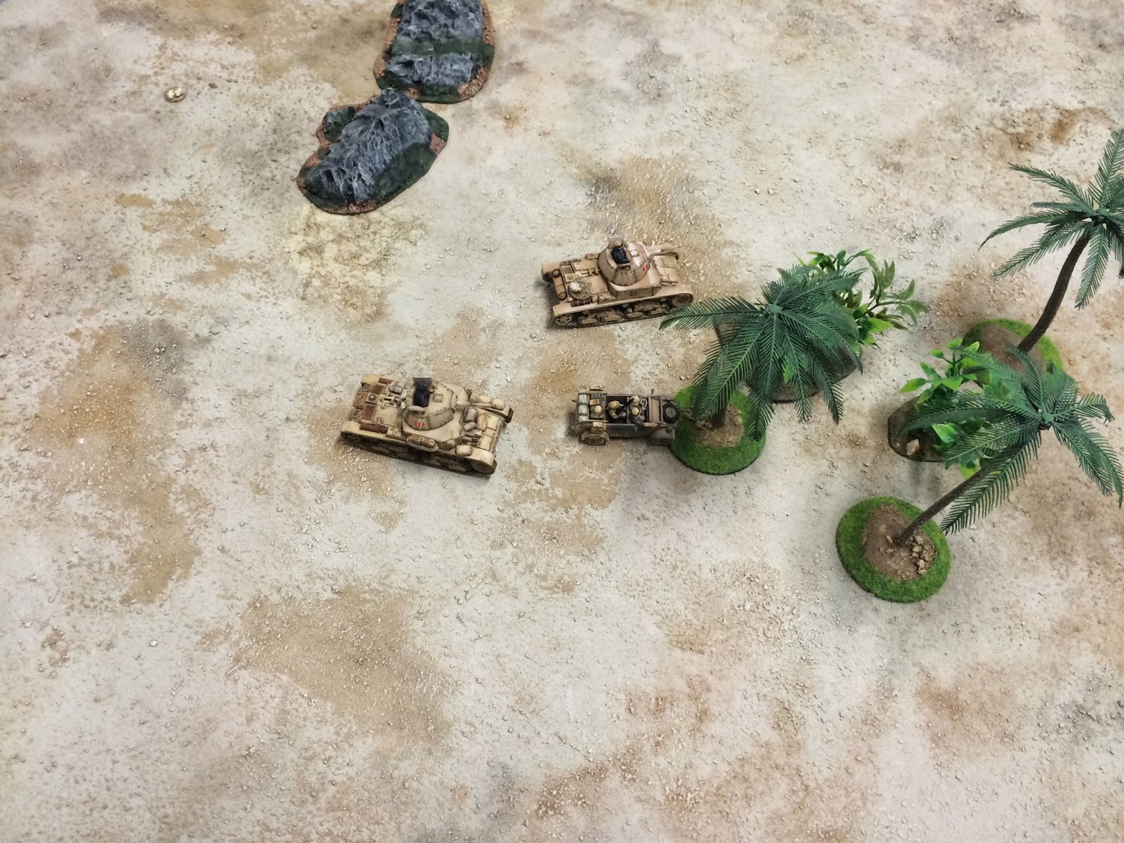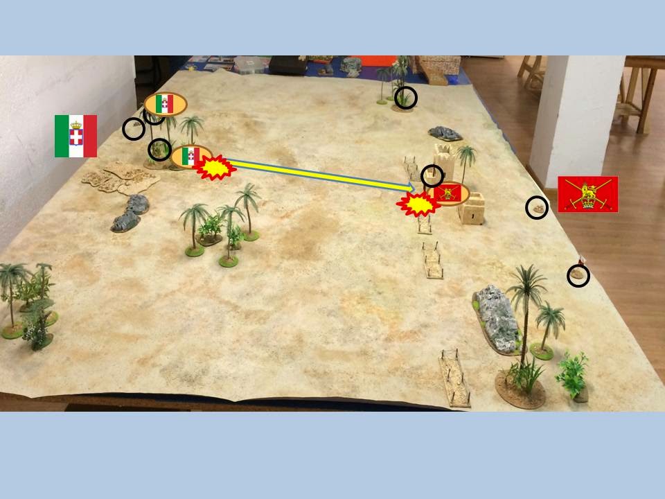 The British reacted deploying a weak section among the palms to the right of its line but did not dare to expose to the Italian LMGs, except for a two-man a patrol that aimed to direct a small mortar fire on the Italians (the patrol was wiped out by the LMGs in the following activation).