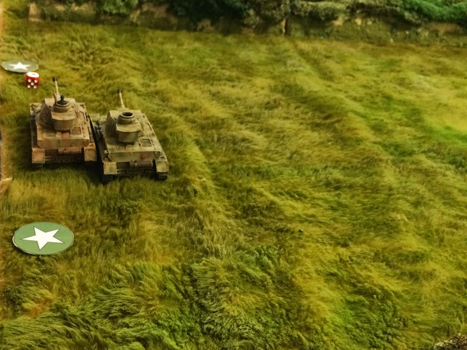 Initially everything was as planned: the MG and the HE fire of the tanks made several casualties, the junior leader was wounded and the unit started to accumulate some shock. Understandably, the British squad run to hide behind a high bocage wall, so the Panzers decided to move flat out to capture the jump off points ignoring the squad for the time being. I then deployed an infantry squad in the nearest jumpoff point to wipe out the survivors, but given the distance I estimated that will need around 2-3 phases to chase the British.