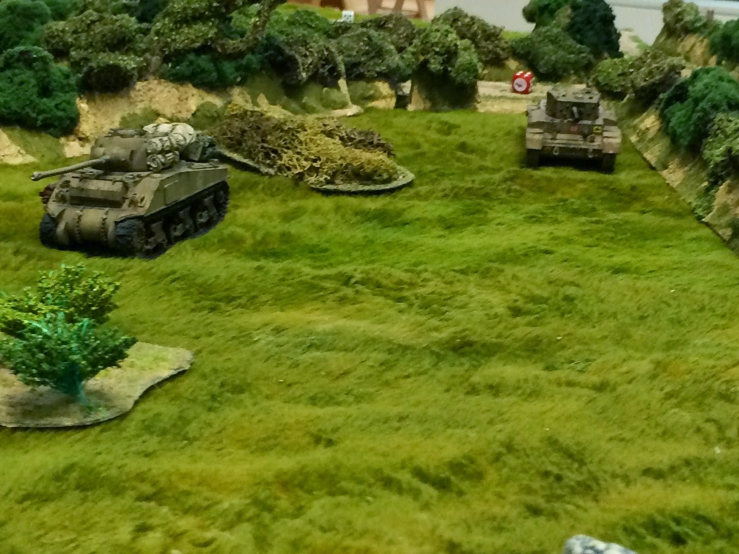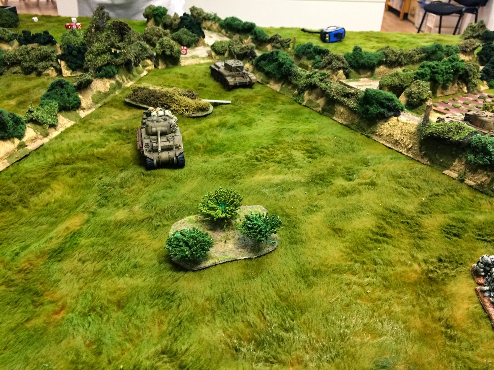 Below is a photo of the gaming table, a typical Normandy landscape, with the farm indicating that we were fighting in the outskirts of Villers Bocage, the main campaign objective. I decided to organise my defensive line around the house, cover my right flank with a minefield and deploy the panzers on my left.