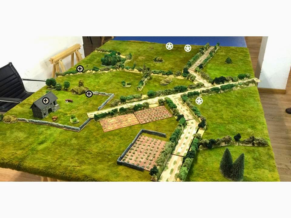 This photo also illustrates the position of the jumpoff points at the end of the patrol phase. The British had a total of three jumpoff points, one was placed across the table facing the farm, and the remaining two on the extreme left of their line. We (Germans) concentrated the jumpoff points around the farm, in line with our master plan.