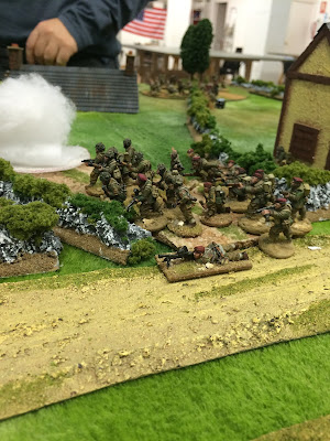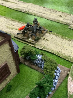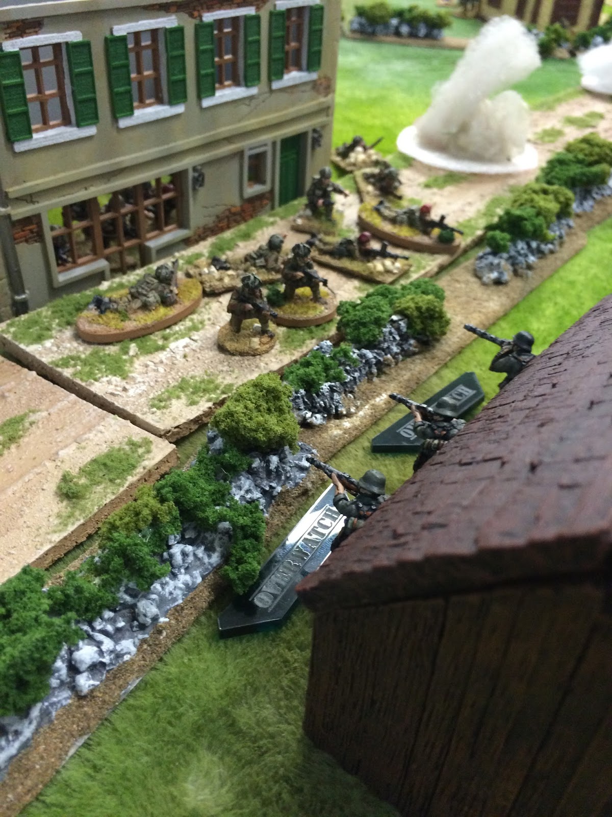 Our buildup was significantly slower (the British were using the barrage support option) and by the time we had some significant troops on the table, the house of the north was already under a heavy-mortar battery barrage and the troops were advancing under cover of smoke deployed by the British 2-inch mortars.
