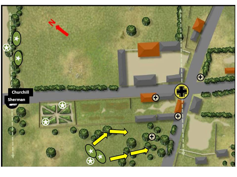 In addition, a Churchill AVRE escorted by a Sherman Firefly emerged in the road, looking to start pounding the farm compound, and two sections of the other British platoon provide covering fire from the tree line at the edge of the Allied tactical side.