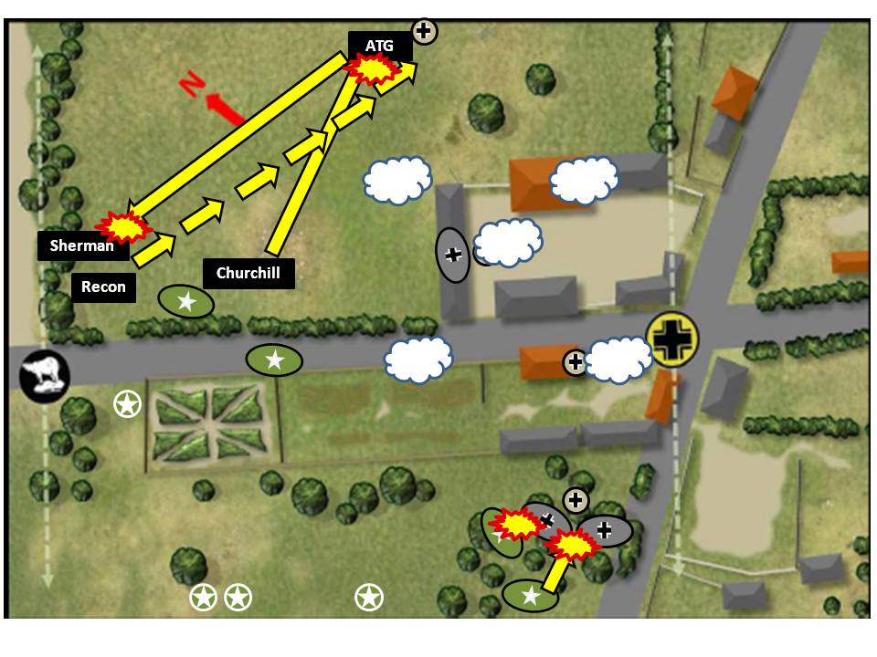 The British platoon Force Moral fell to zero and was forced to leave the battlefield. The other British platoon was still intact and decided to continue the attack. However, having lost the Churchill and with no other artillery support, the British player reassessed the situation and after a couple of additional turns, considered that its was going to be difficult (and bloody) to achieve the victory conditions... declared a retreat and the German achieved the first victory in the campaign.