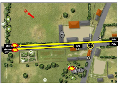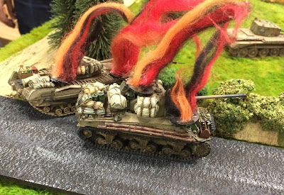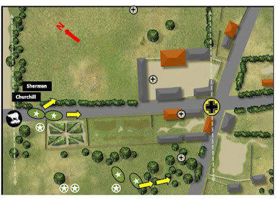 North of the road a Sherman and a Churchill emerged. The Sherman was destroyed by a Pak 40 but this in turn was disabled by the Churchill. A smoke screen covering the farm and the main road blocked the LOS of any German tank emerging at the other edge of the table.